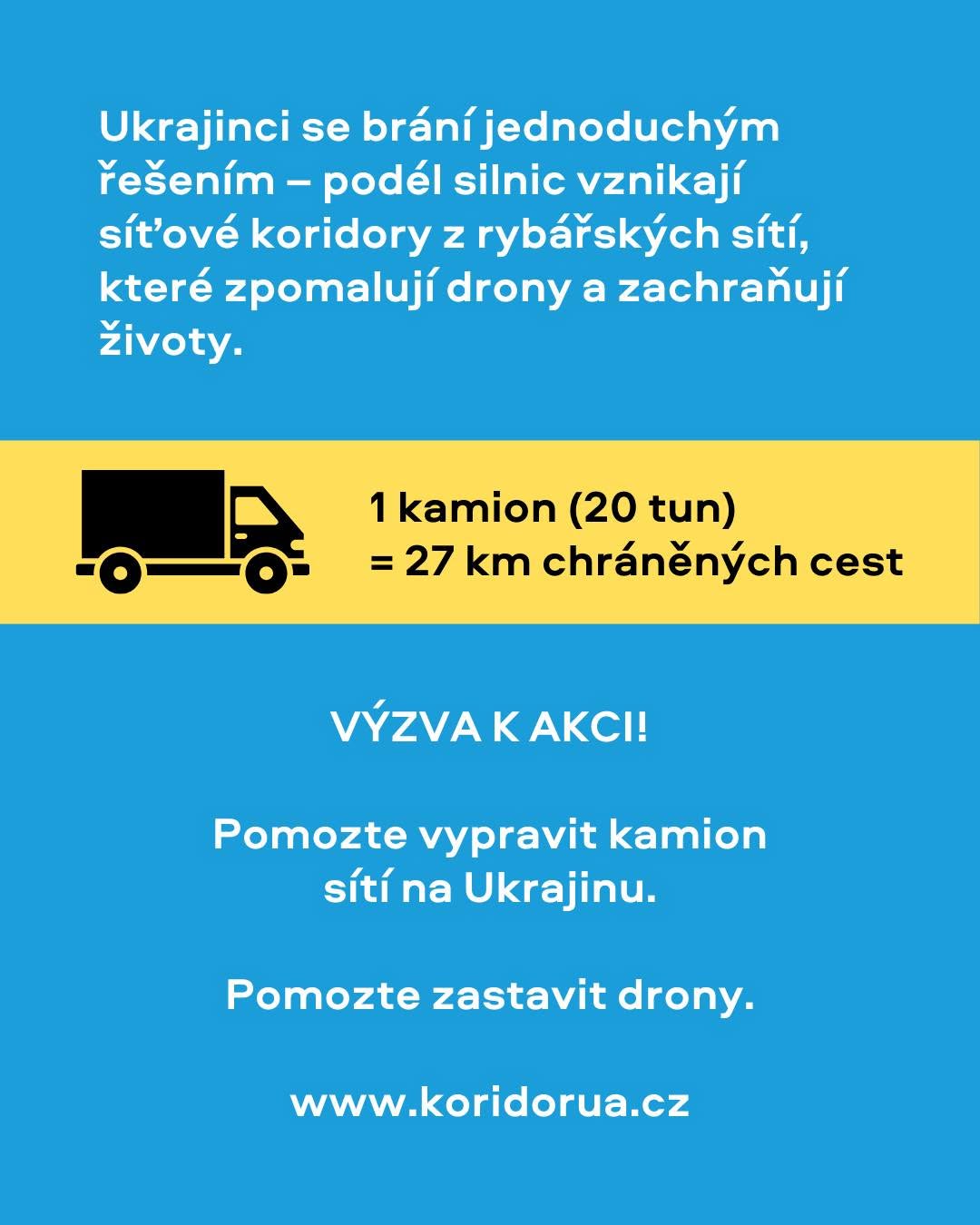 Koridor UA se po spolupráci se svými partnery v zahraničí domluvil na převozu starých rybářských sítí z Nizozemska, kde jich je obrovské množství, na Ukrajinu. Do této chvíle dovezl na jih země již osm plných kamionů, z nichž každý jeden kamion ochrání před útoky dronů až 25 kilometrů silnic. Sítě také chrání nemocnice, sklady i další civilní objekty před útoky bezpilotních letounů. Nezastaví všechno, ale snižují riziko – a v prostředí, kde je každé snížení rizika cítit, to má zásadní význam.