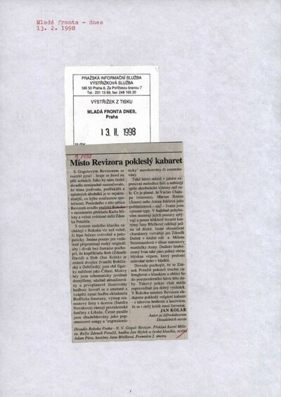 Revizor – to je explozivní anekdota o těch, již majíce v péči blaho obce, pečují jen o blaho vlastní, a o tom, jak naletí jinému typu „šmejda“, než jsou oni sami. Bravurní, věčná komedie o parazitech, s jejichž světem zatřese jedině srážka s parazitem jiného druhu. Historka, kterou původně vyprávěl Gogolovi Puškin a která se posléze strašně nelíbila carovi.
